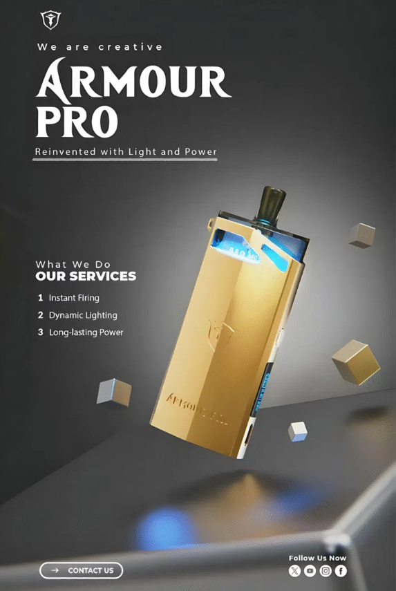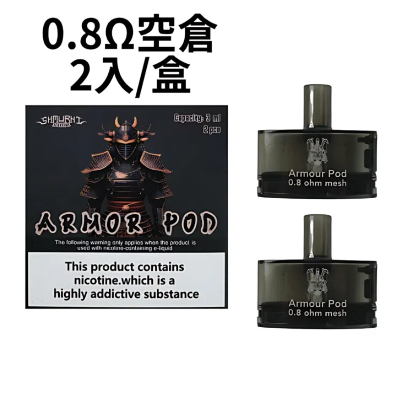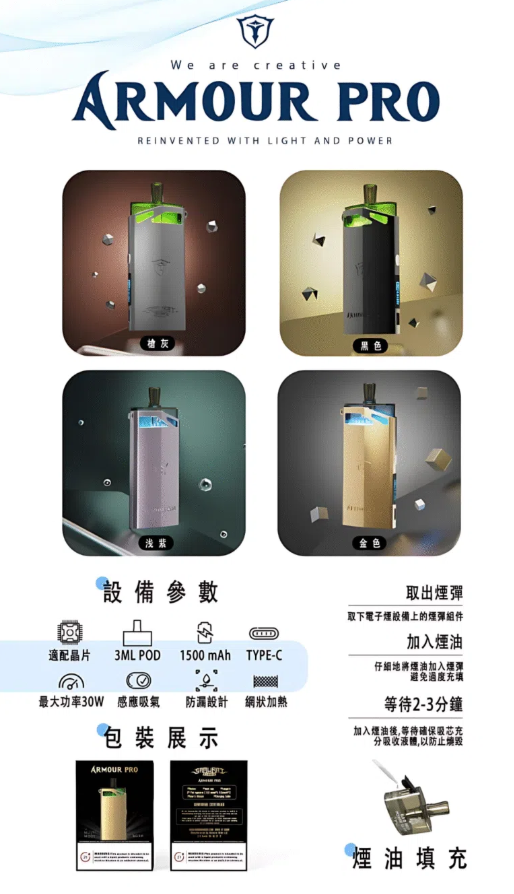 SAMURAI Armour Pro 將軍 PRO 發光主機是一款集外觀設計、強力性能與實用功能於一身的高階可注油電子煙設備。支援多段瓦數調節與 LED 燈效顯示,滿足進階玩家的吸煙體驗需求。搭配新款 0.6Ω/0.8Ω 網狀加熱彈,口感更細膩,煙霧更飽滿。