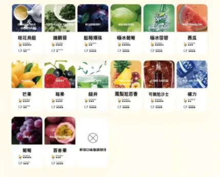 | 口味 | 烏龍茶, 芒果奶昔, 奇異果, 雪碧, 西瓜冰, 草莓牛奶, 橙冰, 冰藍莓, 多汁葡萄, 冰紅茶, 錄豆, 水蜜桃, 鐵觀音, 老冰棍, 冰荔枝, 百香果, 冰可樂, 菠蘿, 莓果冰, 深海冰泉, 青蘋果, 金裝紅酒, 彩虹糖, 紅心芭樂, 薄荷口香糖, 香芋冰激凌, 漿果葡萄柚, 草莓西瓜, 蔓越莓汁, 綜合水果, 咖啡, 哈密瓜, 芒果百香果, 茉莉龍井 |