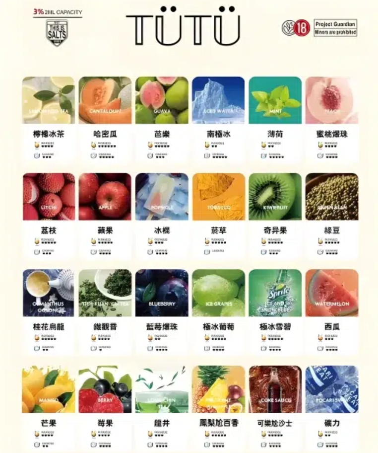 檸檬冰茶 ,哈密瓜 ,芭樂 ,南極冰 ,薄荷 ,蜜桃爆珠 ,荔枝 ,蘋果 ,冰棍 ,菸草 ,奇异果 ,綠豆 ,桂花烏龍 ,鐡觀音 ,藍莓爆珠 ,極冰葡萄 ,極冰雪碧 ,西瓜 ,芒果 ,莓果 ,龍井 ,鳳梨尬百香 ,可樂尬沙士 ,礦力 ,葡萄 ,百香果 |
