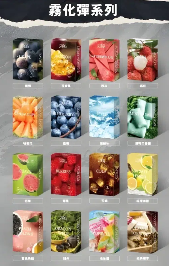 龍井 ,南極冰 ,芭樂 ,荔枝 ,菸草 ,蓝莓 ,葡萄 ,老冰棍 ,百香果 ,檸檬 ,莓果 ,西瓜 ,可樂 ,蜜桃鳥龍 ,口香糖 ,哈密瓜 |