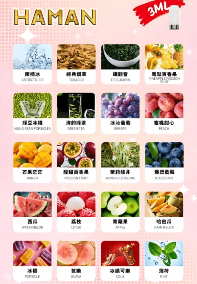 Haman煙彈的口味種類豐富多樣,滿足了不同用戶的口味偏好。從經典的煙草味到清新的水果味,從傳統的茶香到獨特的創意口味,總有一款適合你。