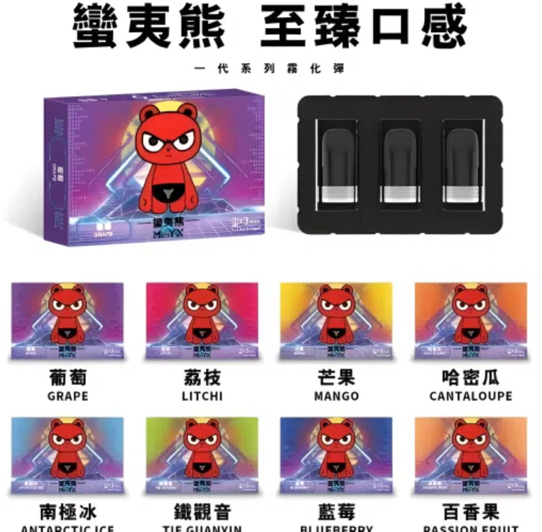 蠻夷熊煙彈是Man YX品牌推出的一款一代通用系列電子煙煙彈,具有以下特點和資訊: