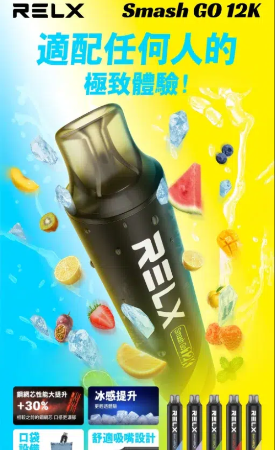 RELX Smash GO 12K 是一款專為重度使用者設計的一次性電子煙,內建大容量電池與煙油配置,主打 12000 口超長續航。整體機身輕巧好攜帶,搭配人體工學吸嘴設計,吸阻自然順暢、口感穩定。