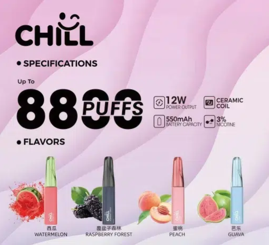 CHILL 8800 Puffs 屬於高口數一次性電子煙設備,主打長續航設計與多種風味選擇。